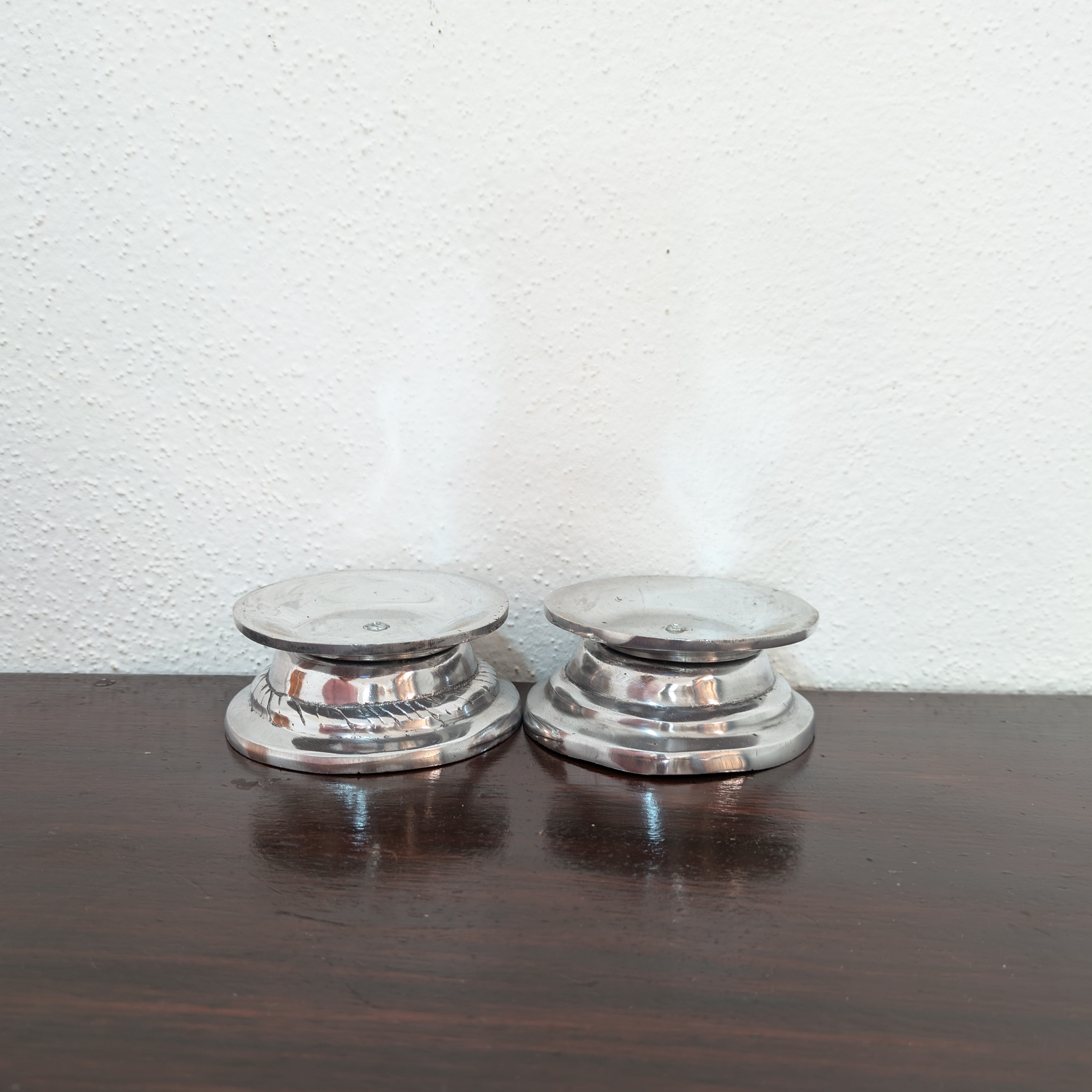 Elegantes porta velas de pewter con base doble, para el altar eucarístico, altares devocionales o decoración en el hogar. Acabado brillante.