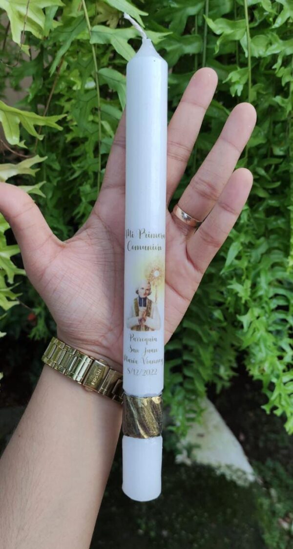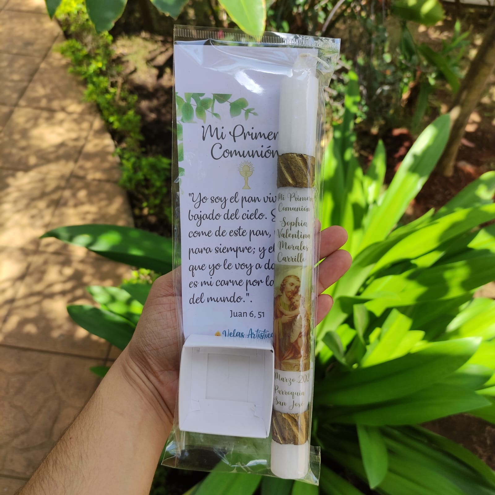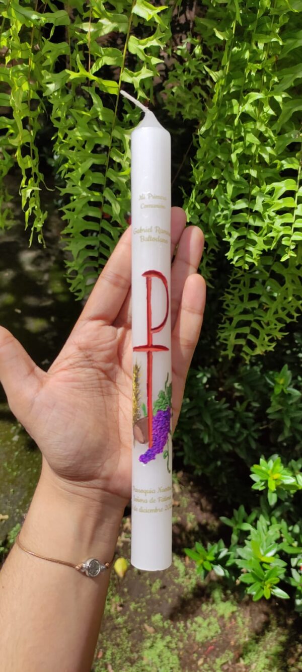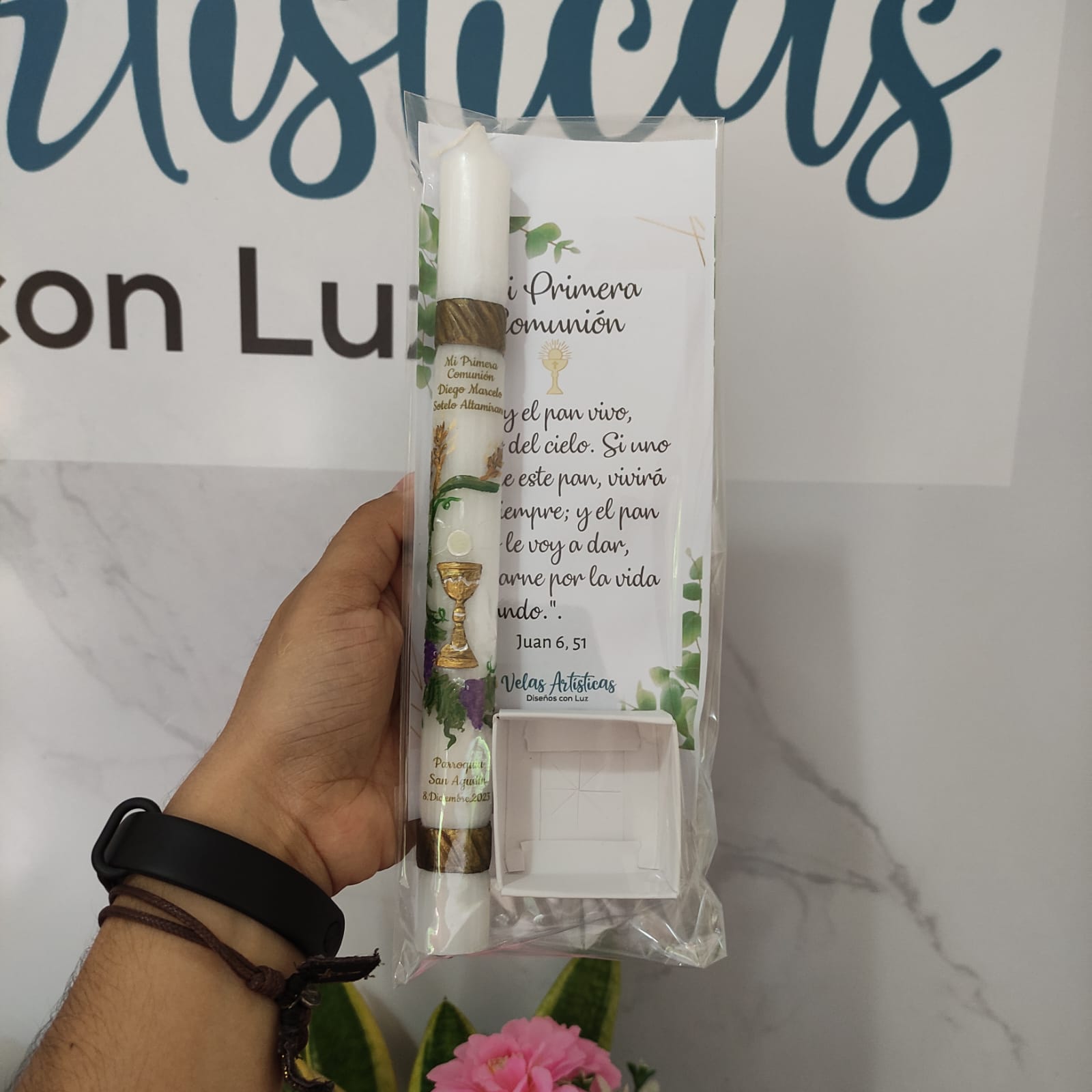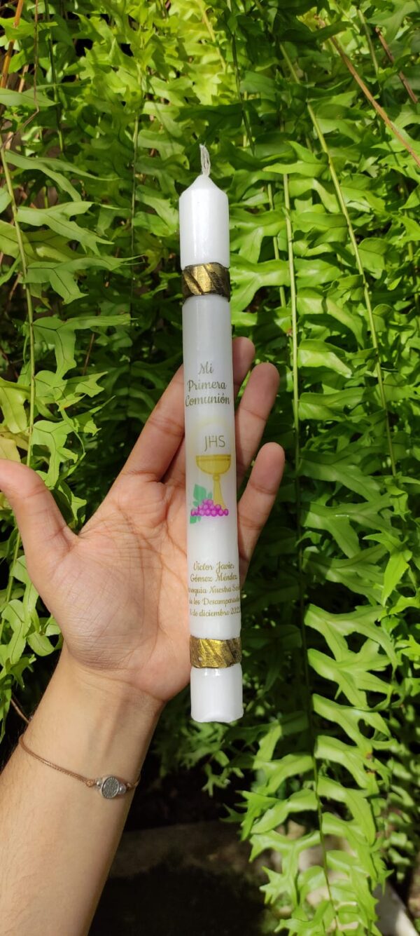 Hermosas candelas de 2.2x25cm para el sacramento de Primera Comunión. Diseño personalizado con arte, datos específicos del niño/a, y demás.