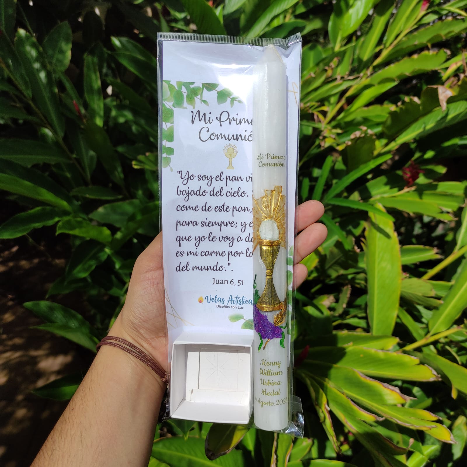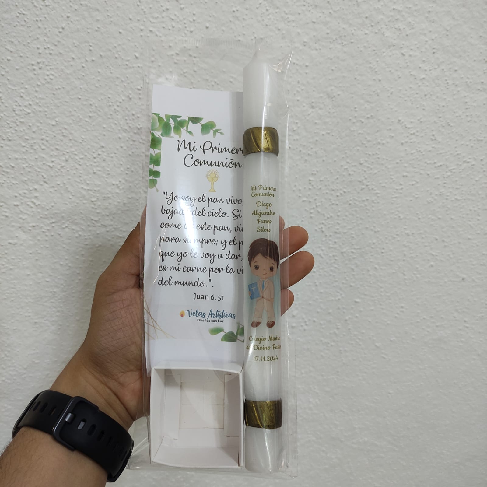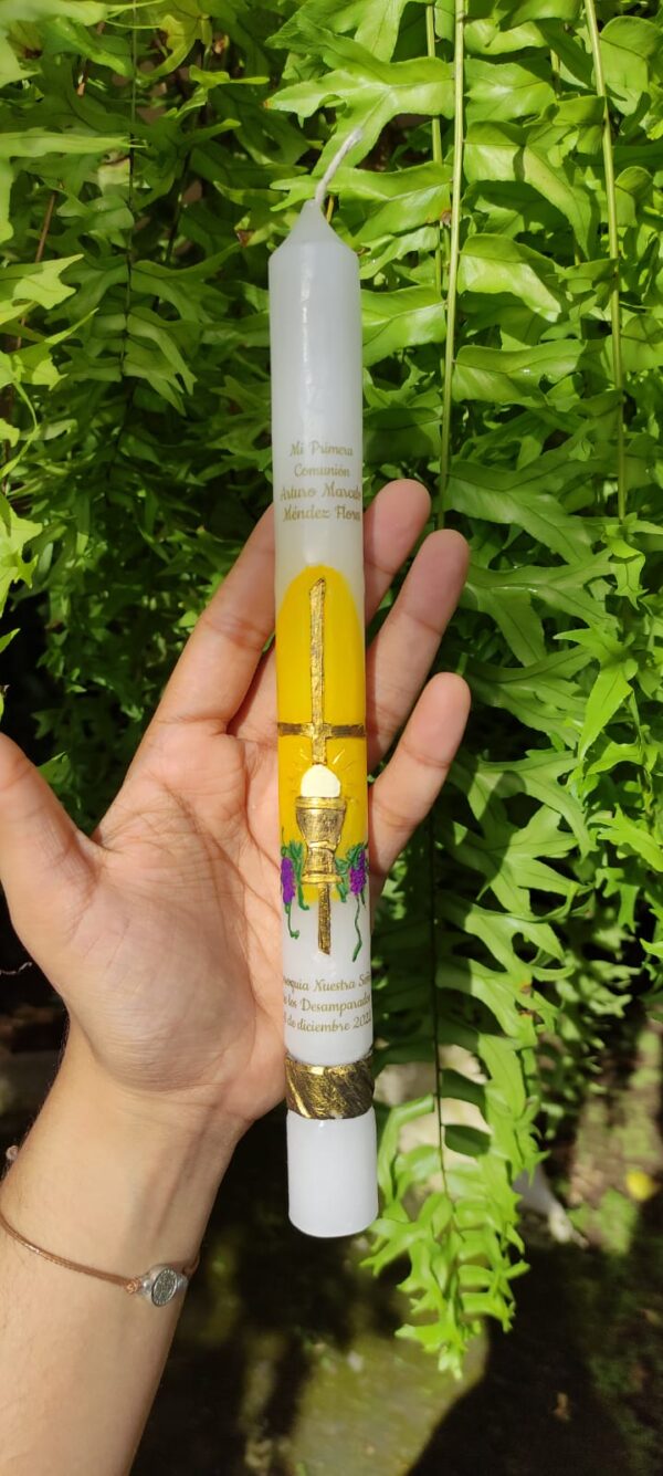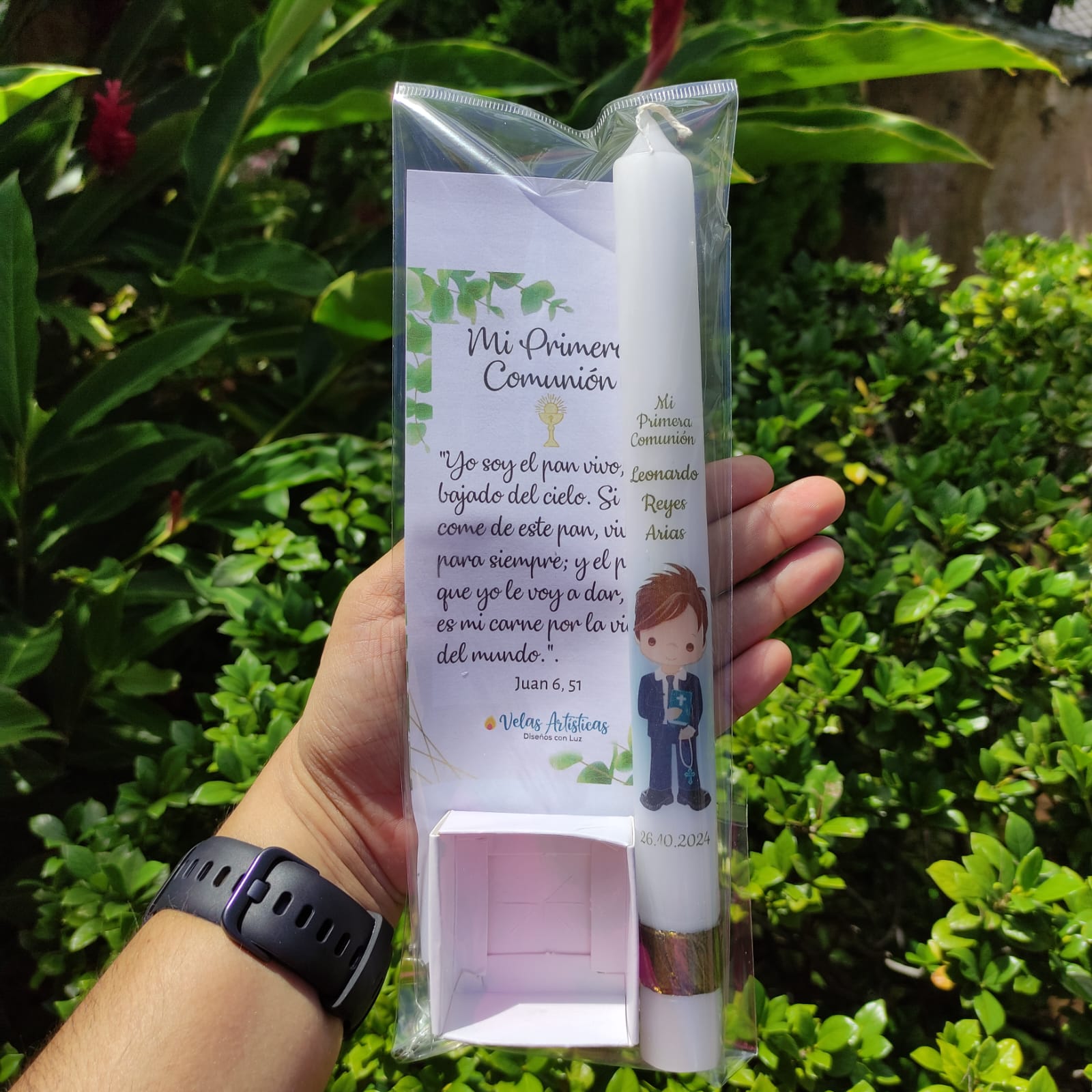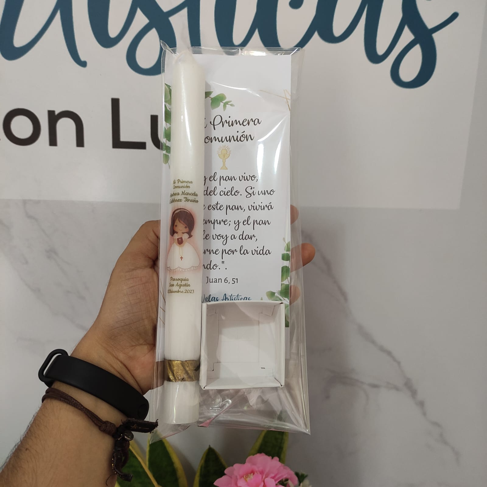 Hermosas candelas de 2.2x25cm para el sacramento de Primera Comunión. Diseño personalizado con arte, datos específicos del niño/a, y demás.