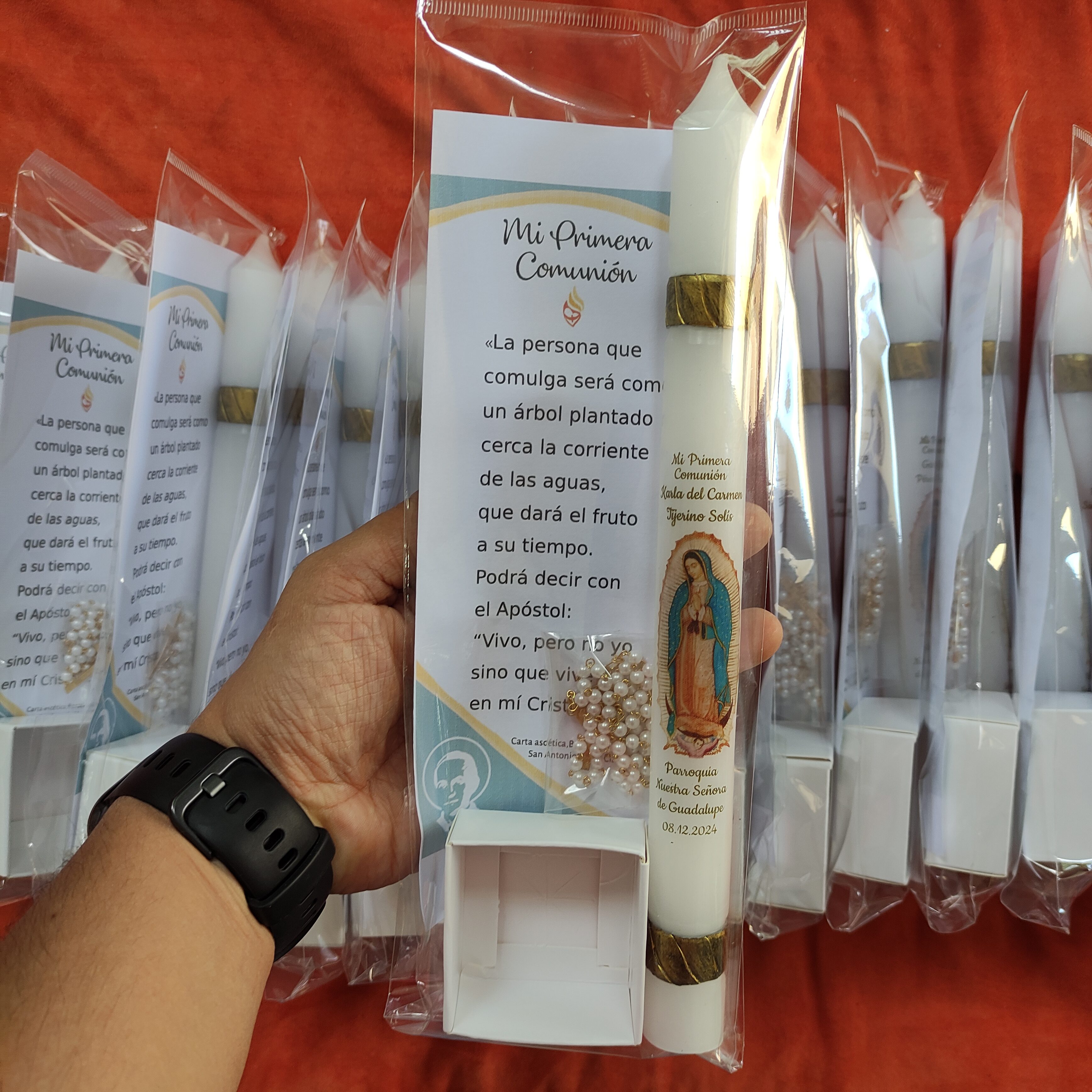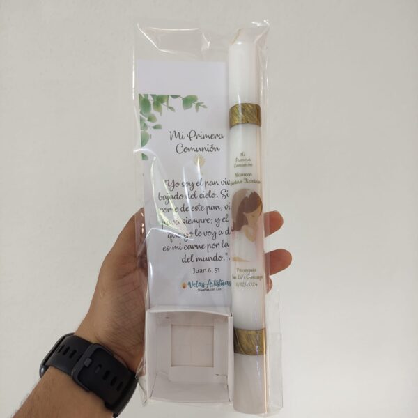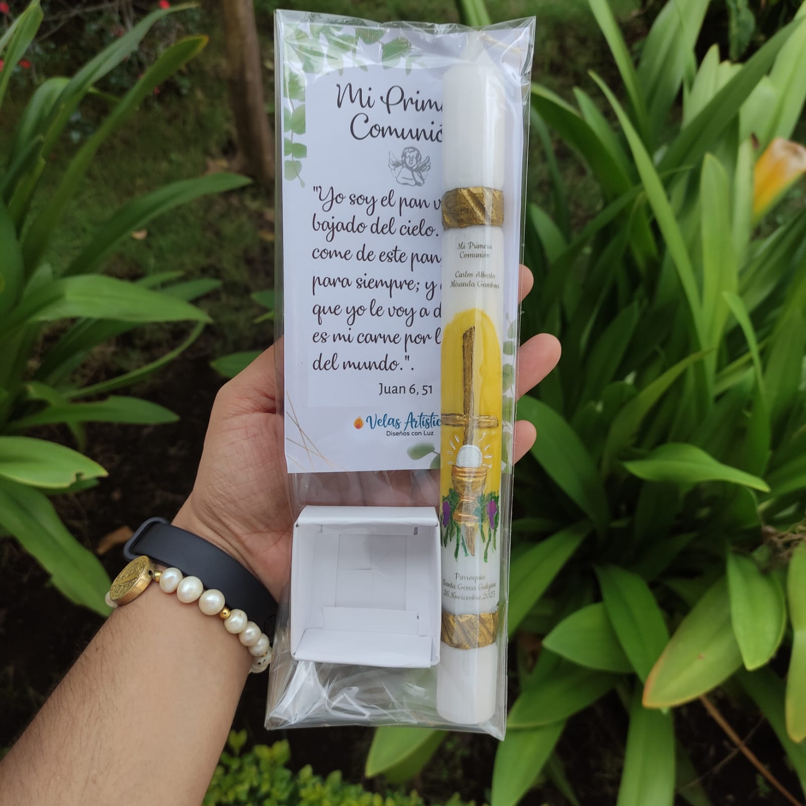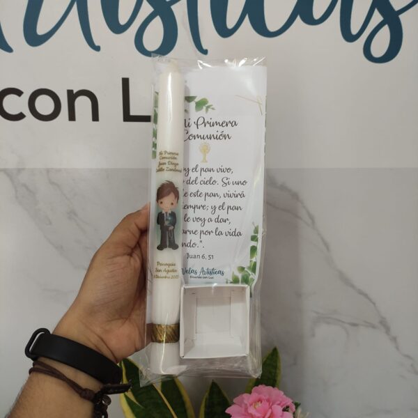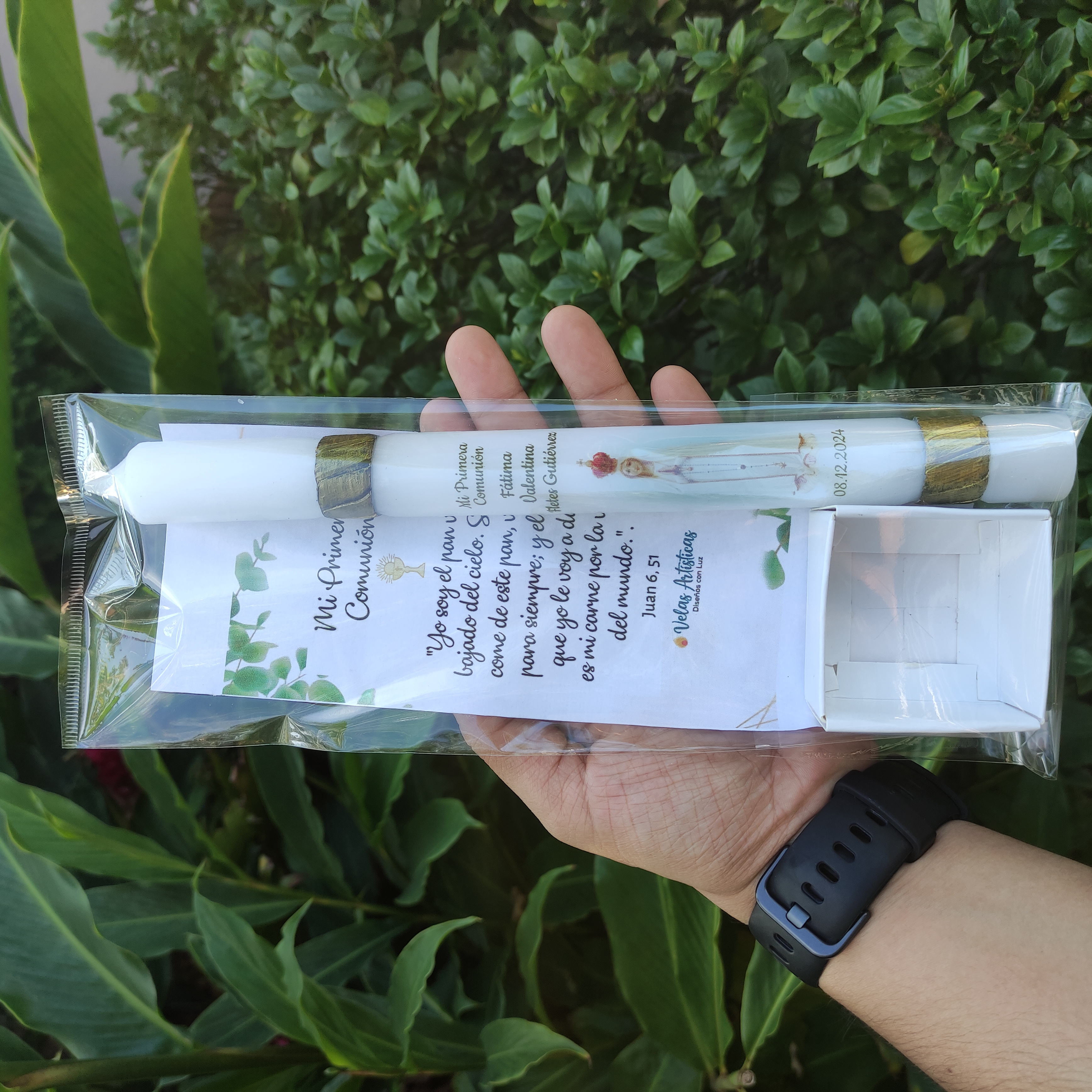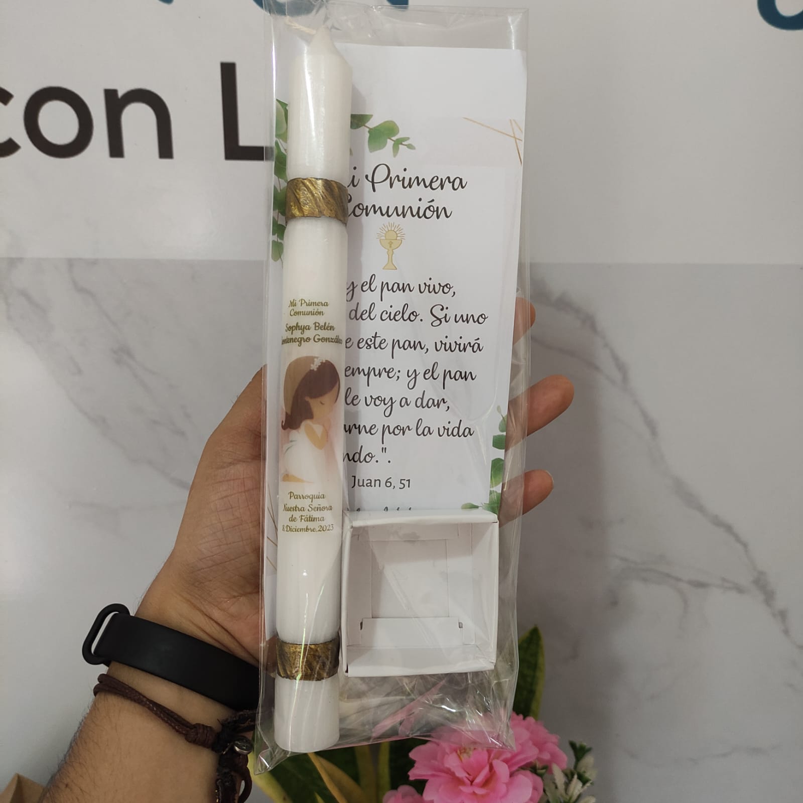 Hermosas candelas de 2.2x25cm para el sacramento de Primera Comunión. Diseño personalizado con arte, datos específicos del niño/a, y demás.