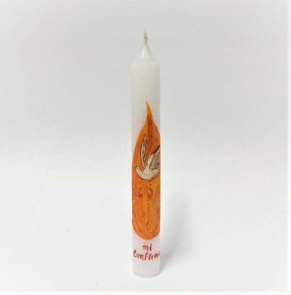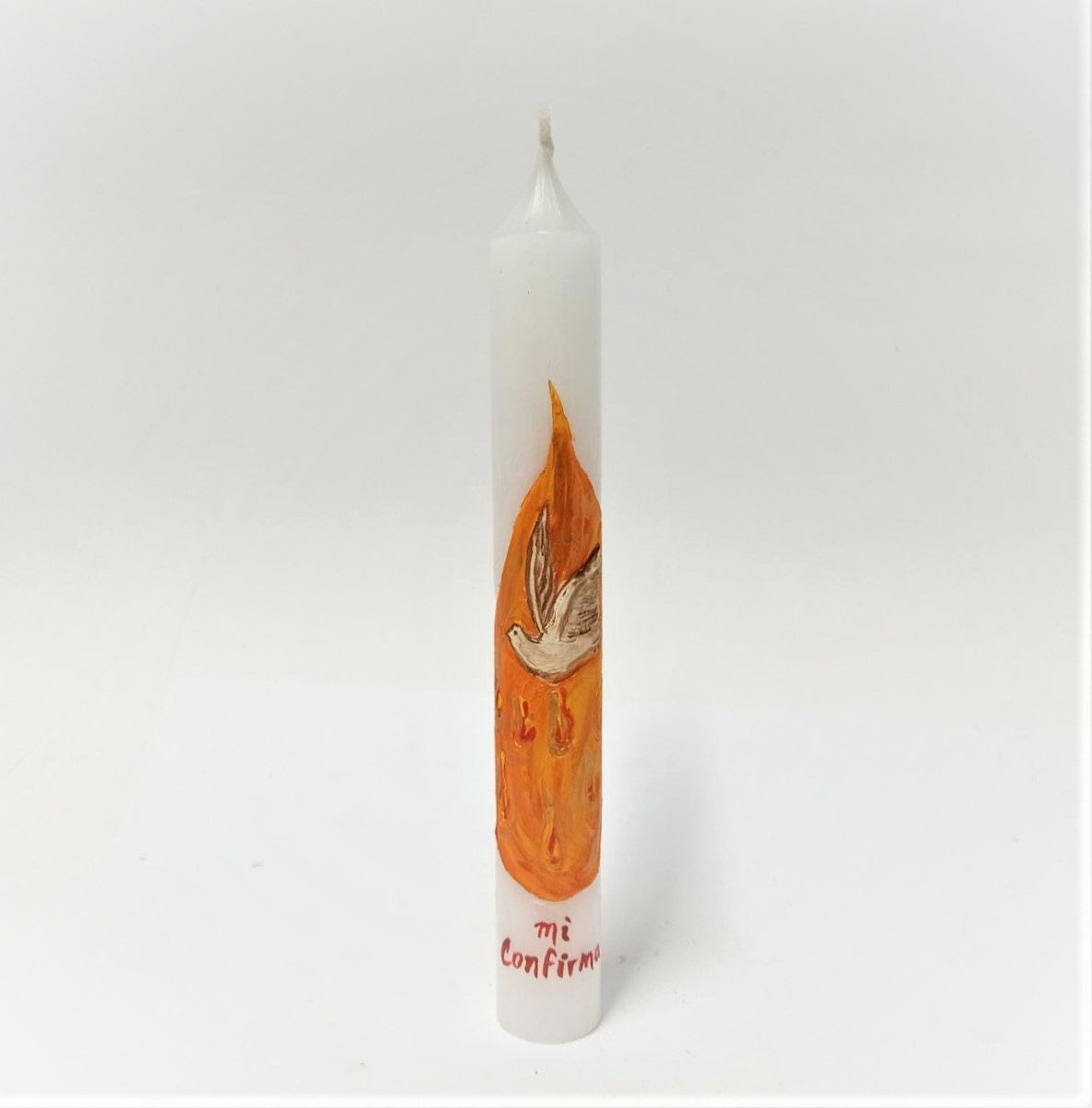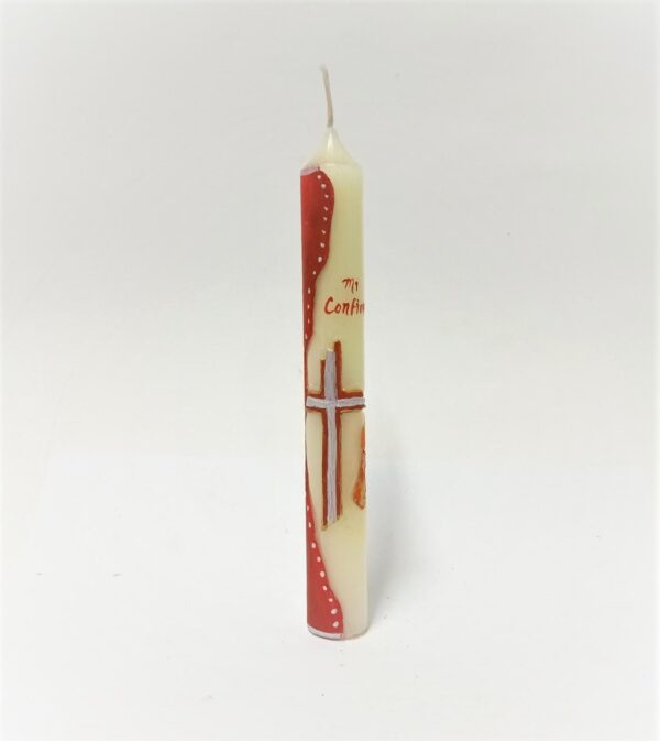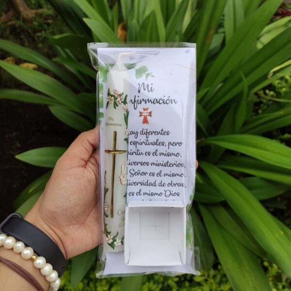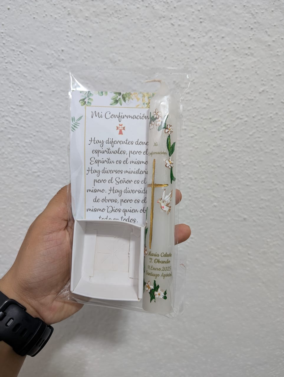Hermosas candelas de 2.2x17cm para el sacramento de Confirmación. Diseño personalizado con arte, datos específicos del niño/a, y demás.