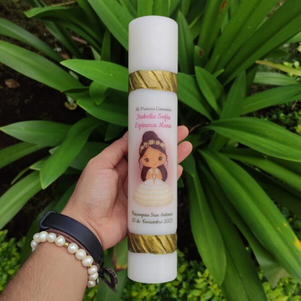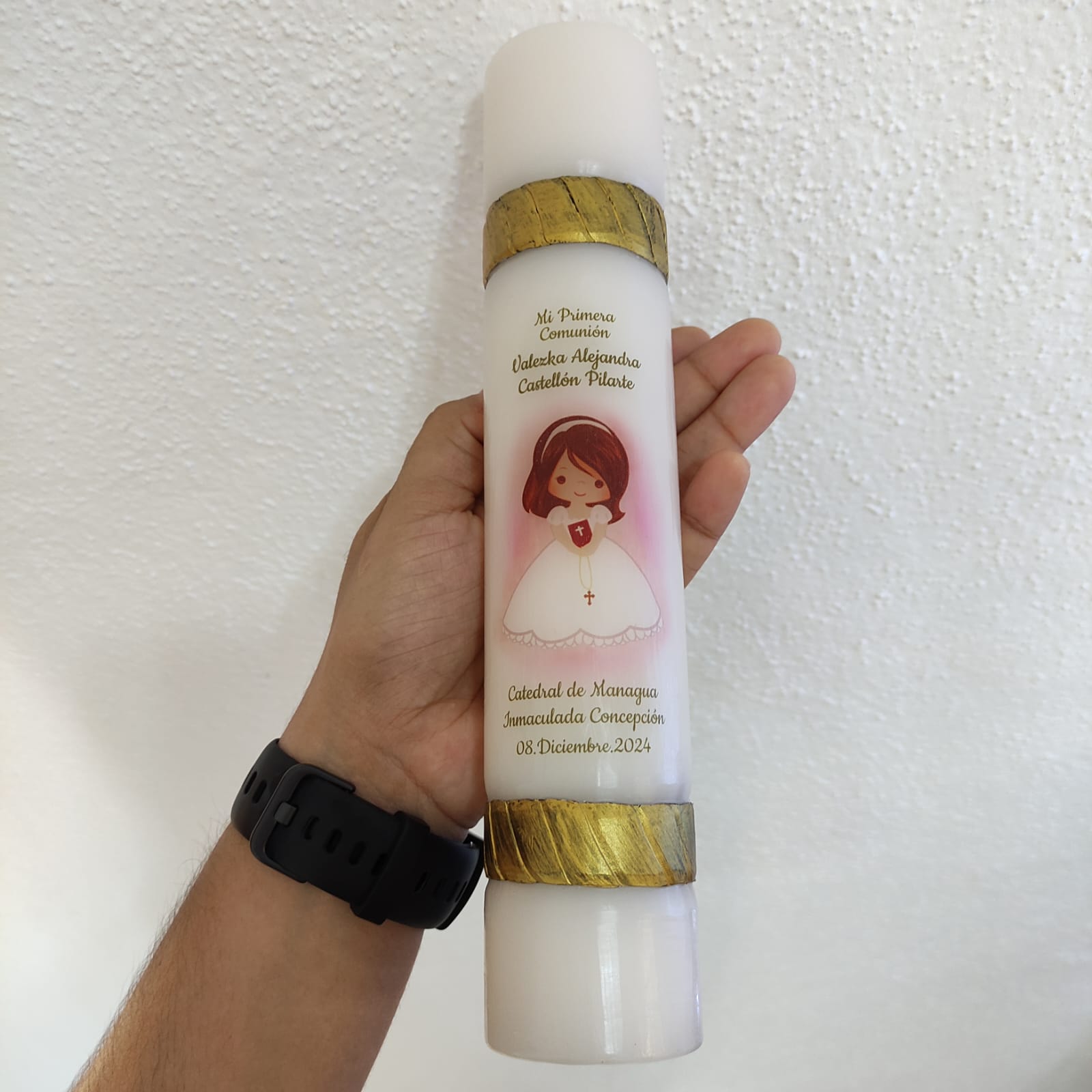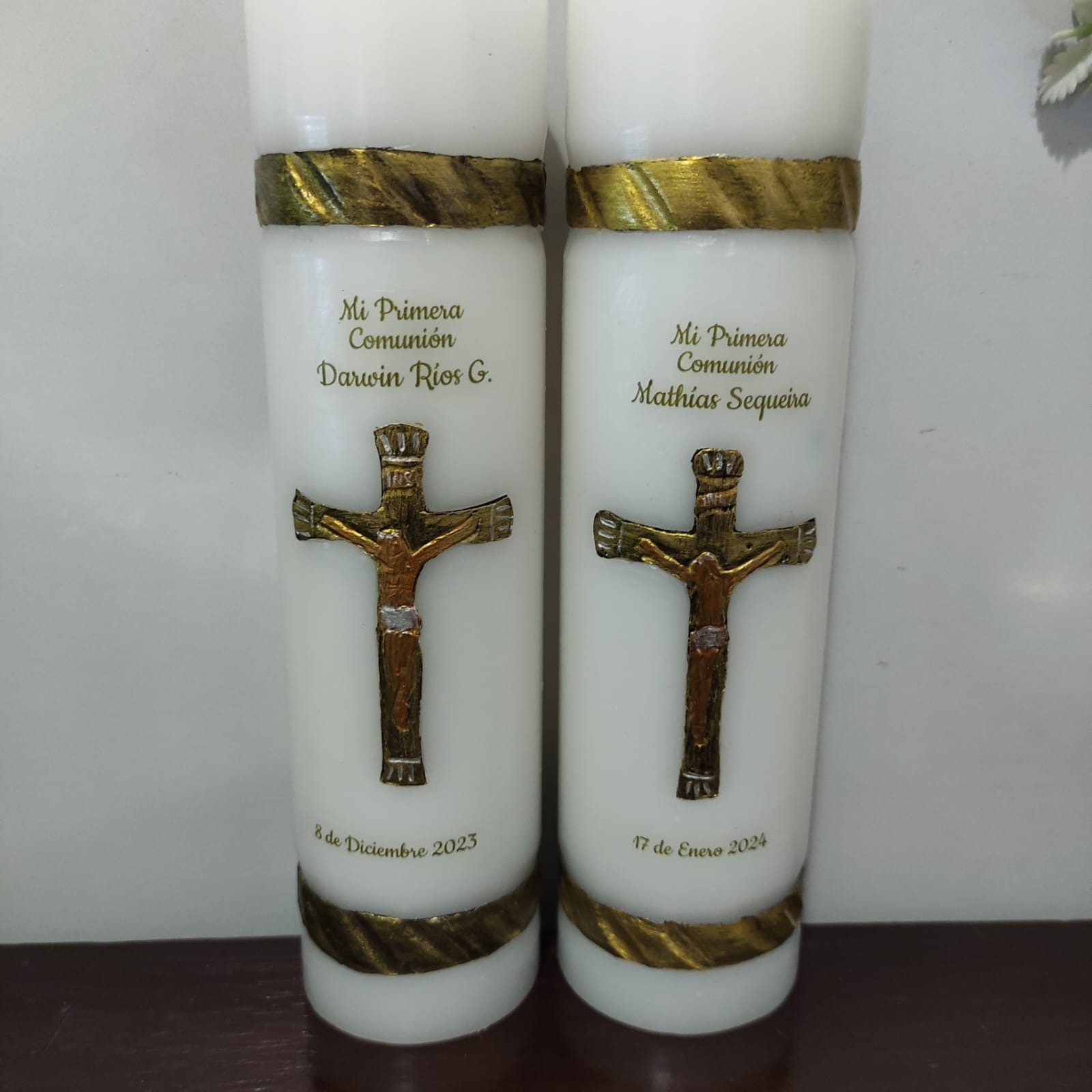 Hermosos cirios de 5 x 25cm para el sacramento de Primera Comunión. Diseño personalizado con arte, datos específicos del niño/a, y demás.