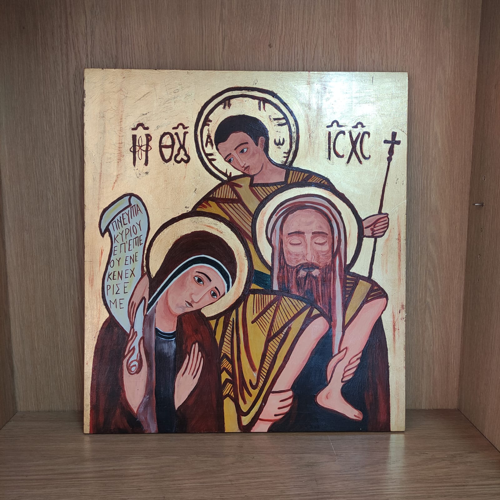 Hermoso icono de la Sagrada Familia de Nazaret. Autor Francisco Argüello (Kiko), con motivo de un encuentro mundial de familias impulsado por el papa Juan Pablo II. Ideal para veneración en parroquias, capillas o en el altar doméstico.